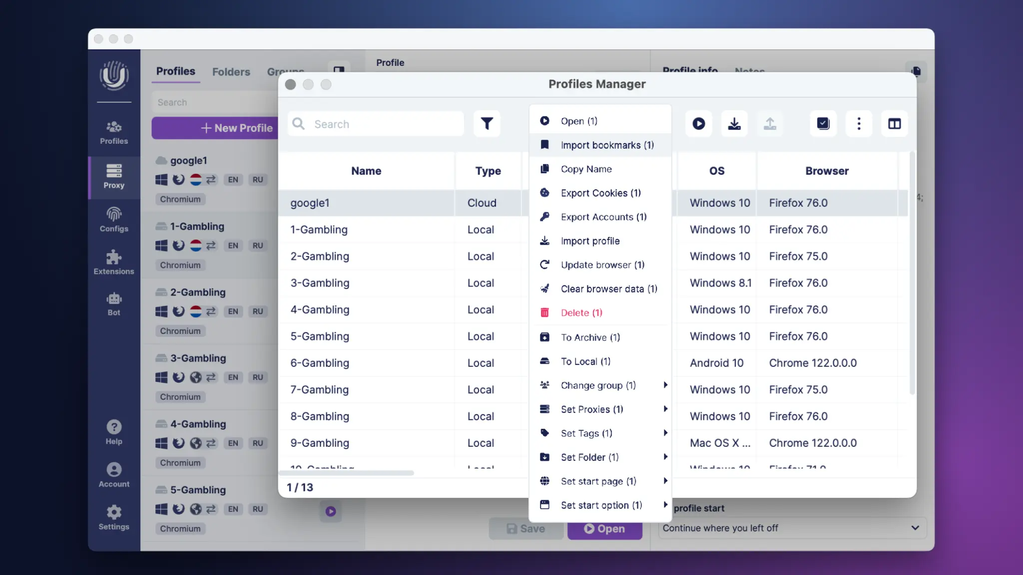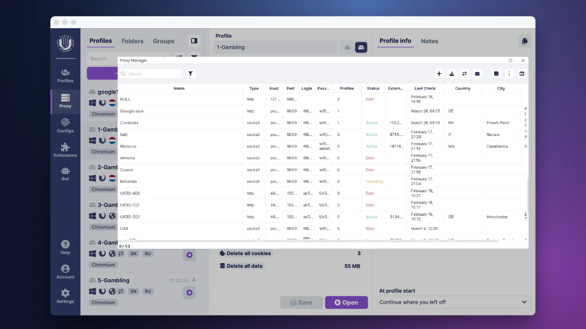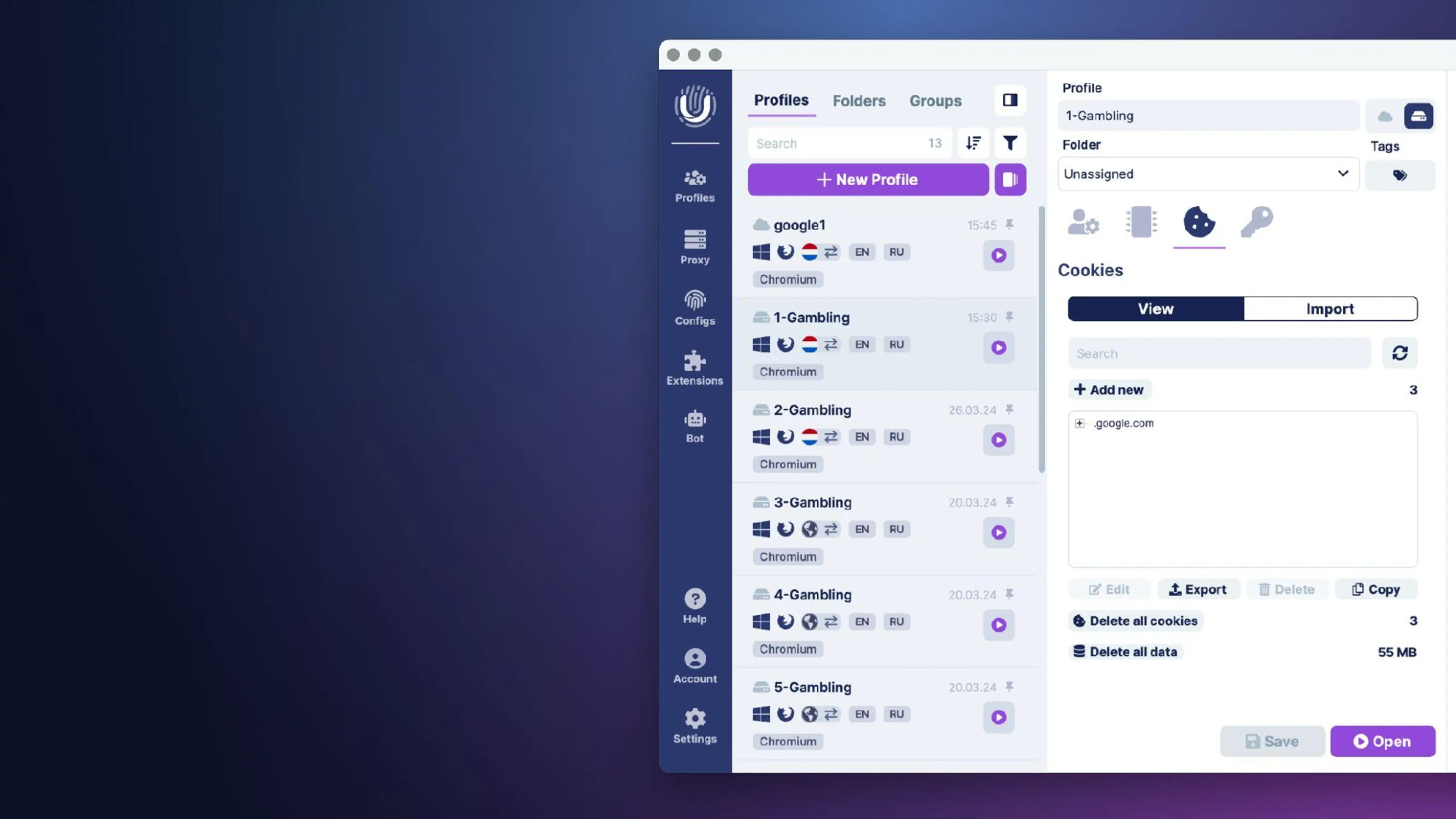 A few clicks, and you can generate hundreds of distinct profiles through configurations or lists of User-Agents, Cookies, or a general format (Name, Cookies, Proxy-type, Proxy, User-Agents, Notes).