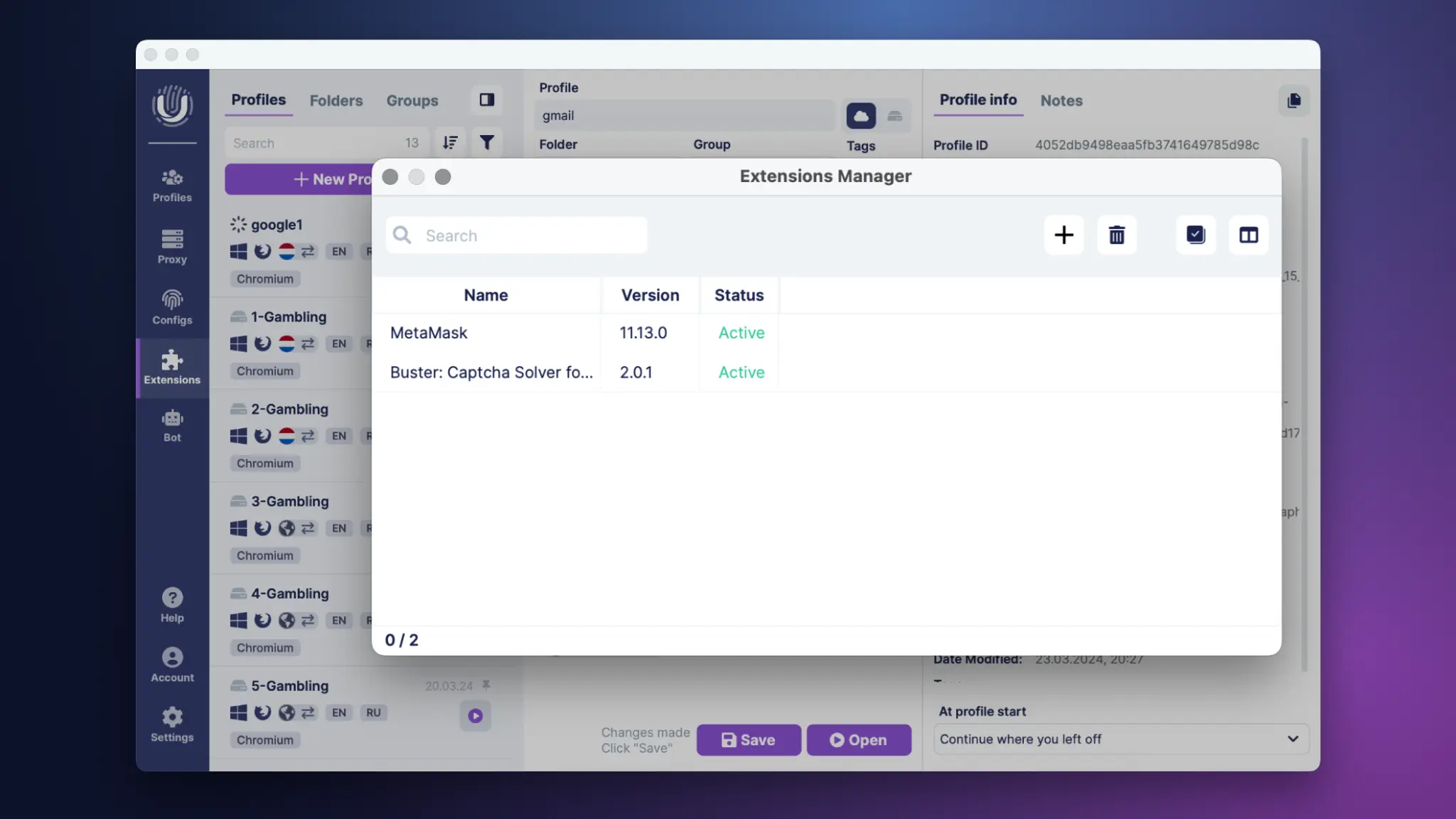 The browser extension manager lets you install extensions to every profile at once, or remove and deactivate them whenever you need.